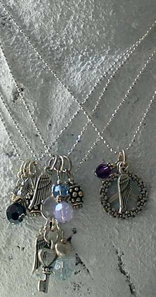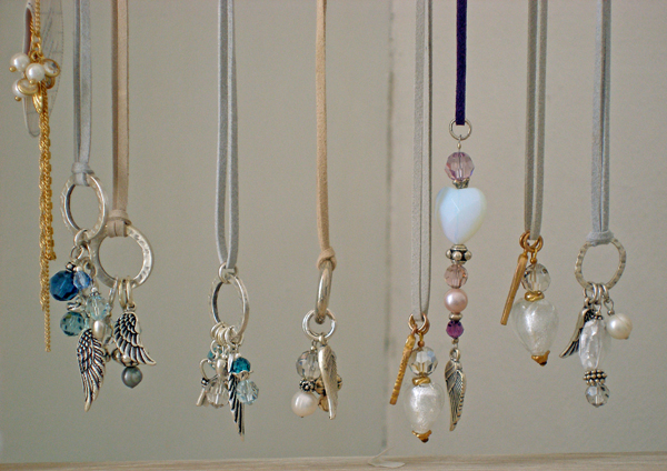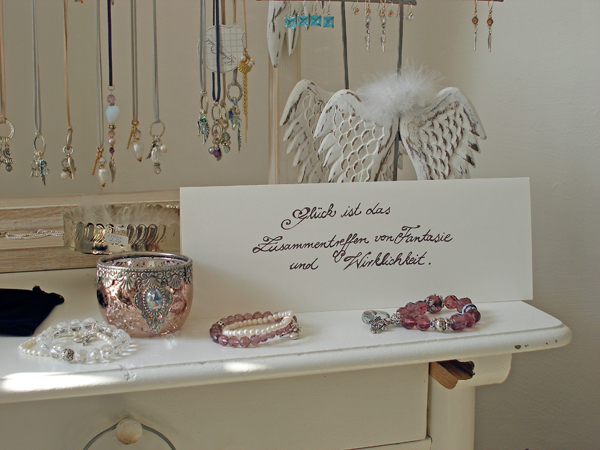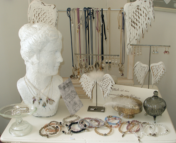 Der von Kabuki liebevoll genannte Engelschmuck ist mit vergoldeten sowie versilberten Elementen, mit Halbedelsteinen, Swarovski- und Süßwasserperlen verarbeitet und enthält immer einen kleinen Engelsflügel.